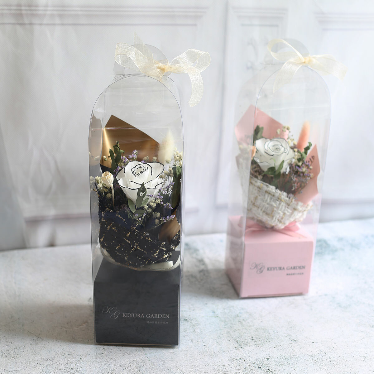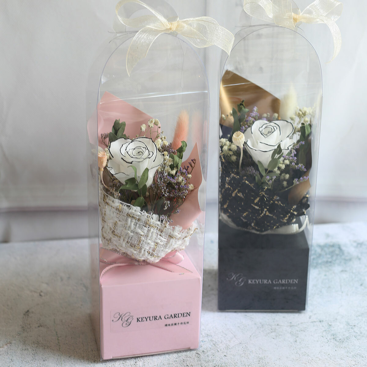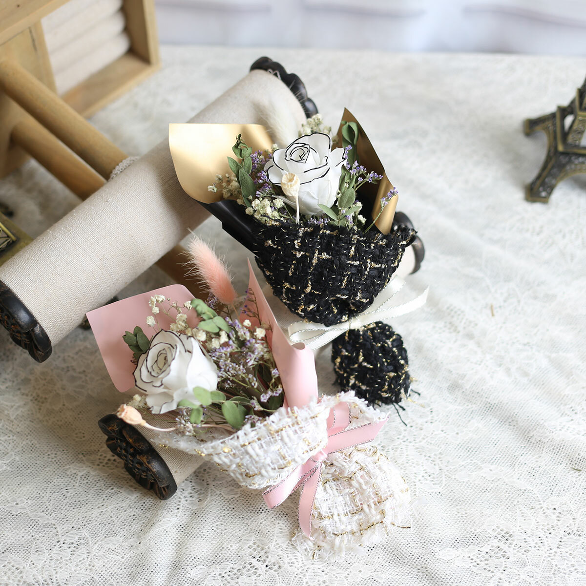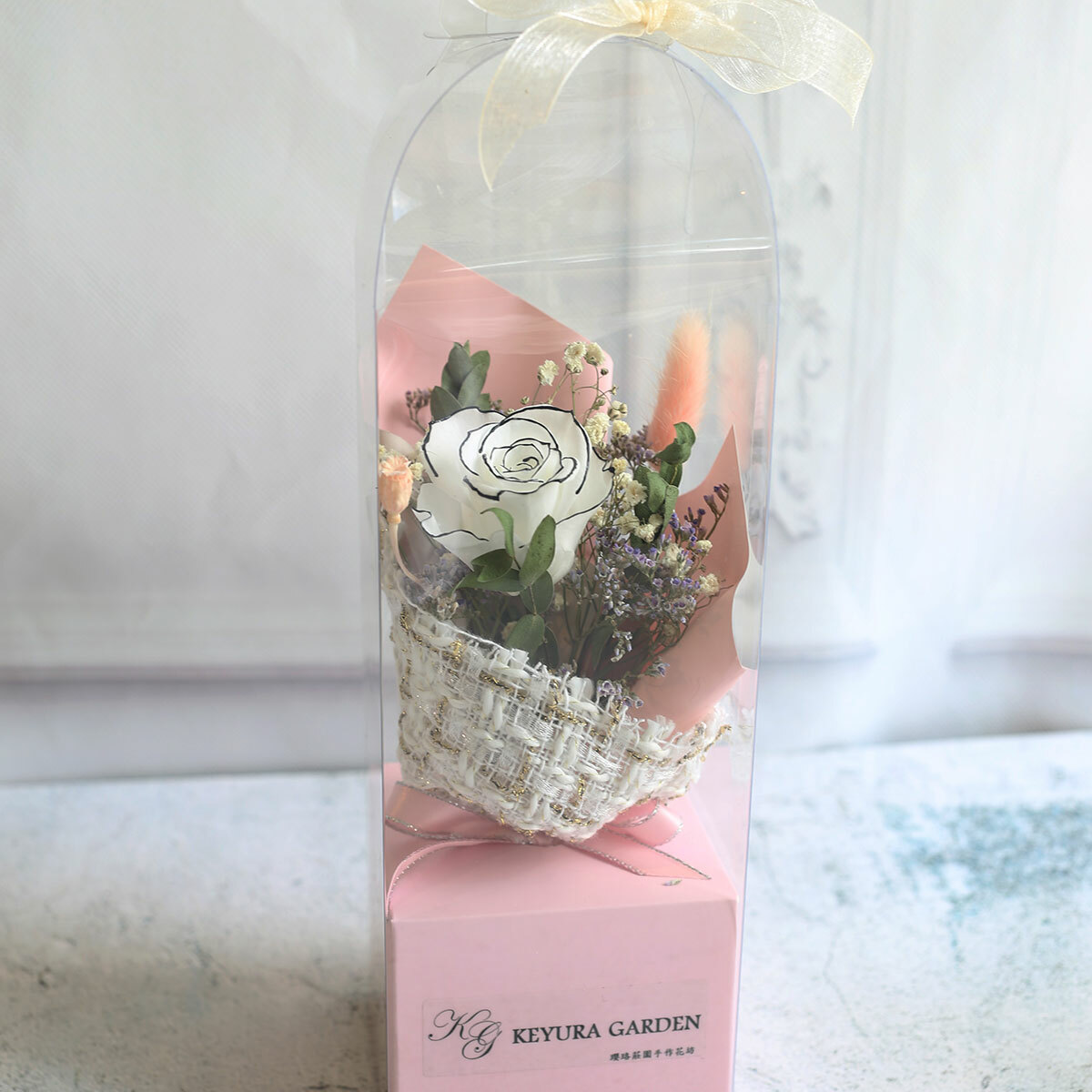 由永生花玫瑰.補血草.乾燥滿天星.尤加利葉.兔尾草.卡斯比亞製作而成的小花束