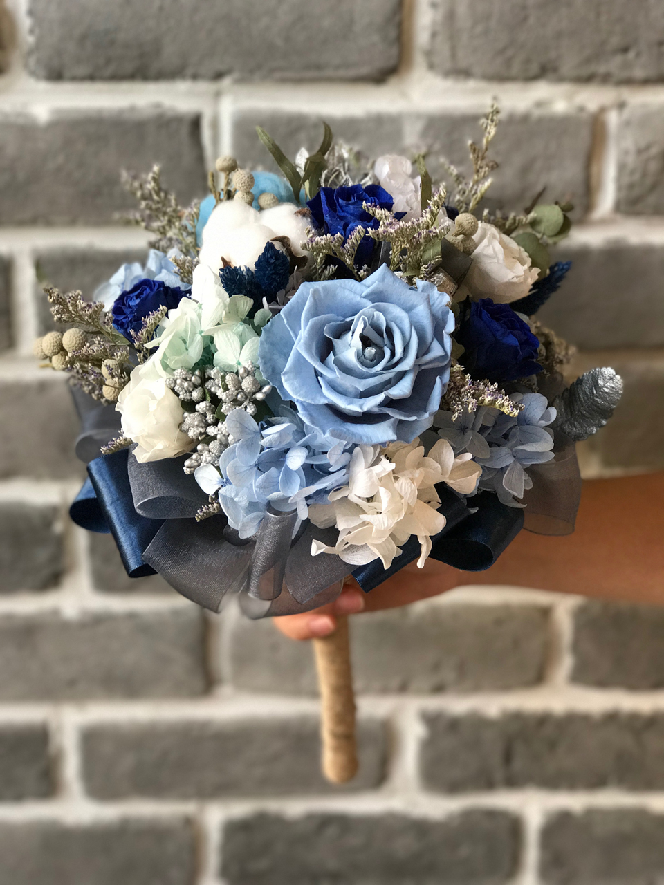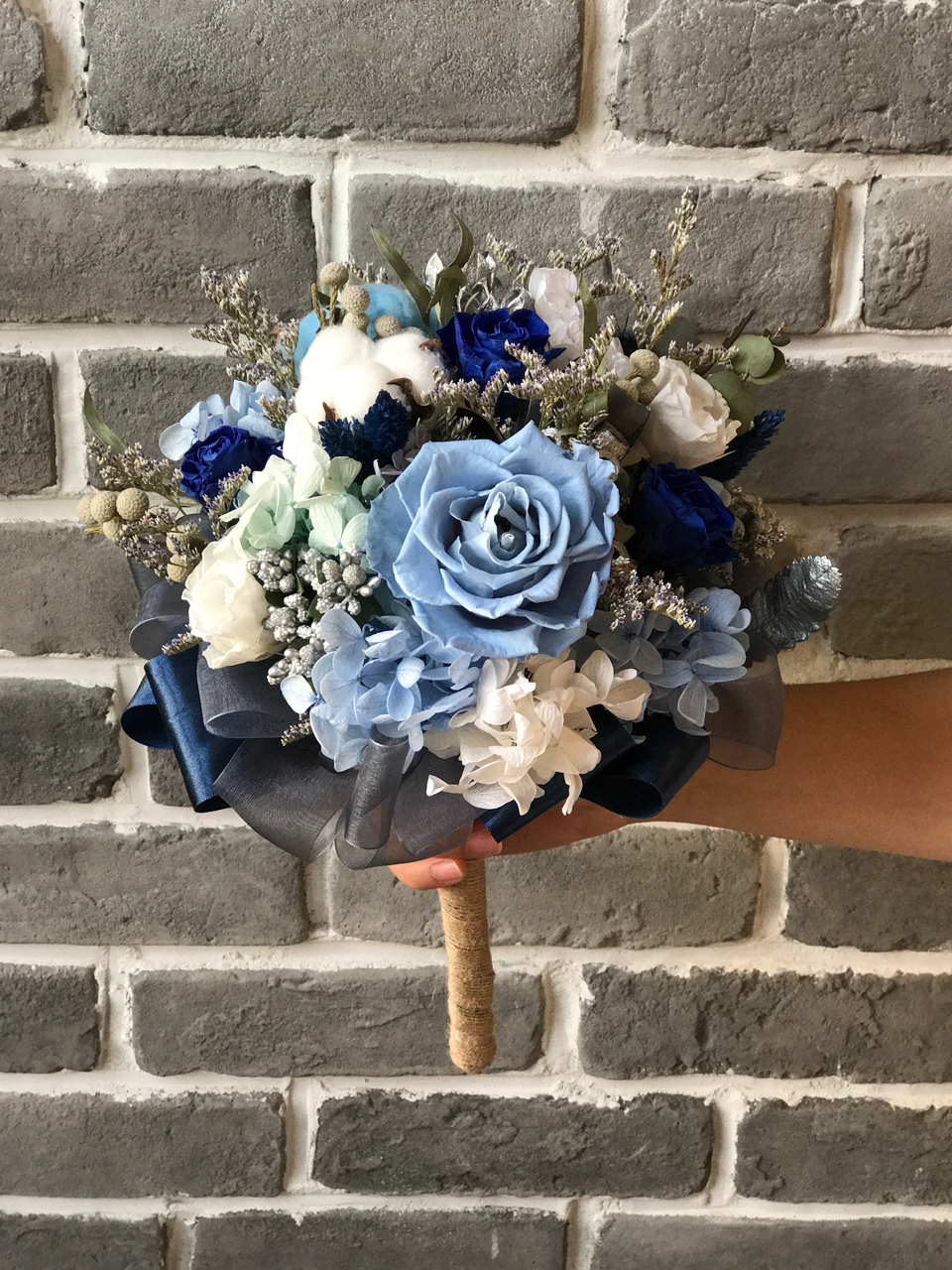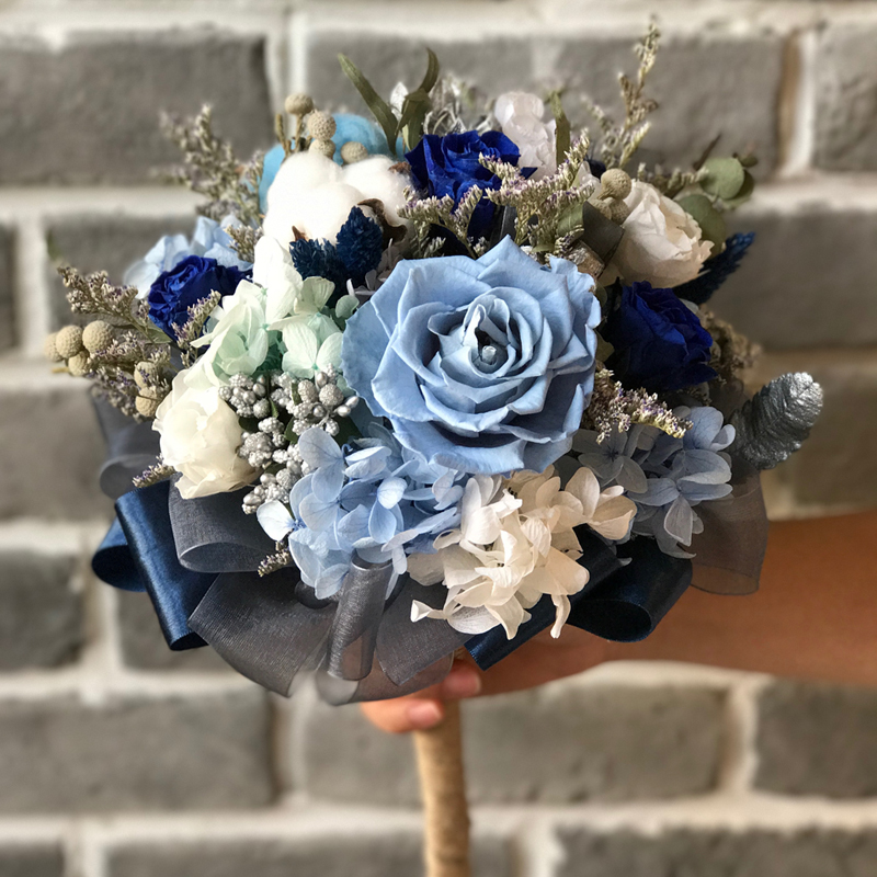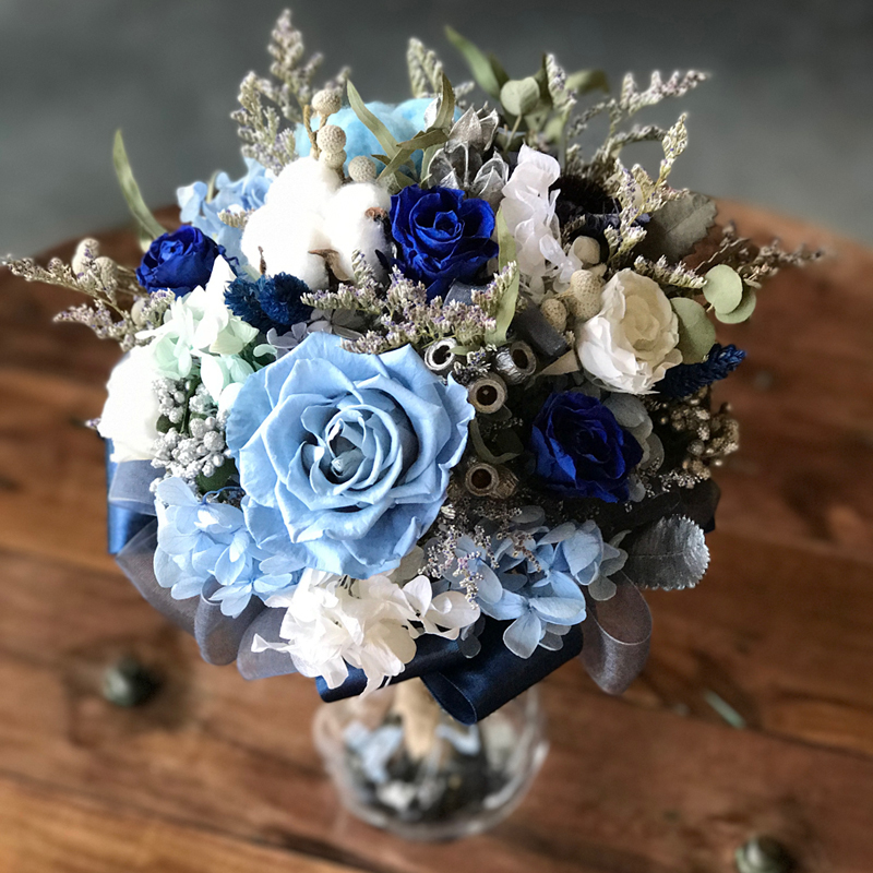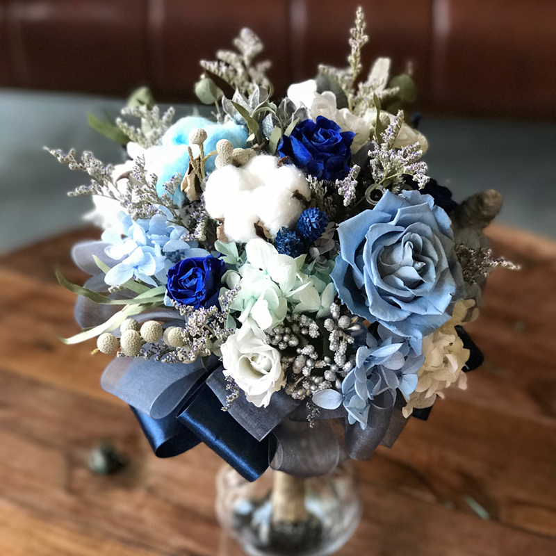 由永生花玫瑰.繡球.棉花.圓仔花.尤佳利.卡氏比亞製作而成的捧花