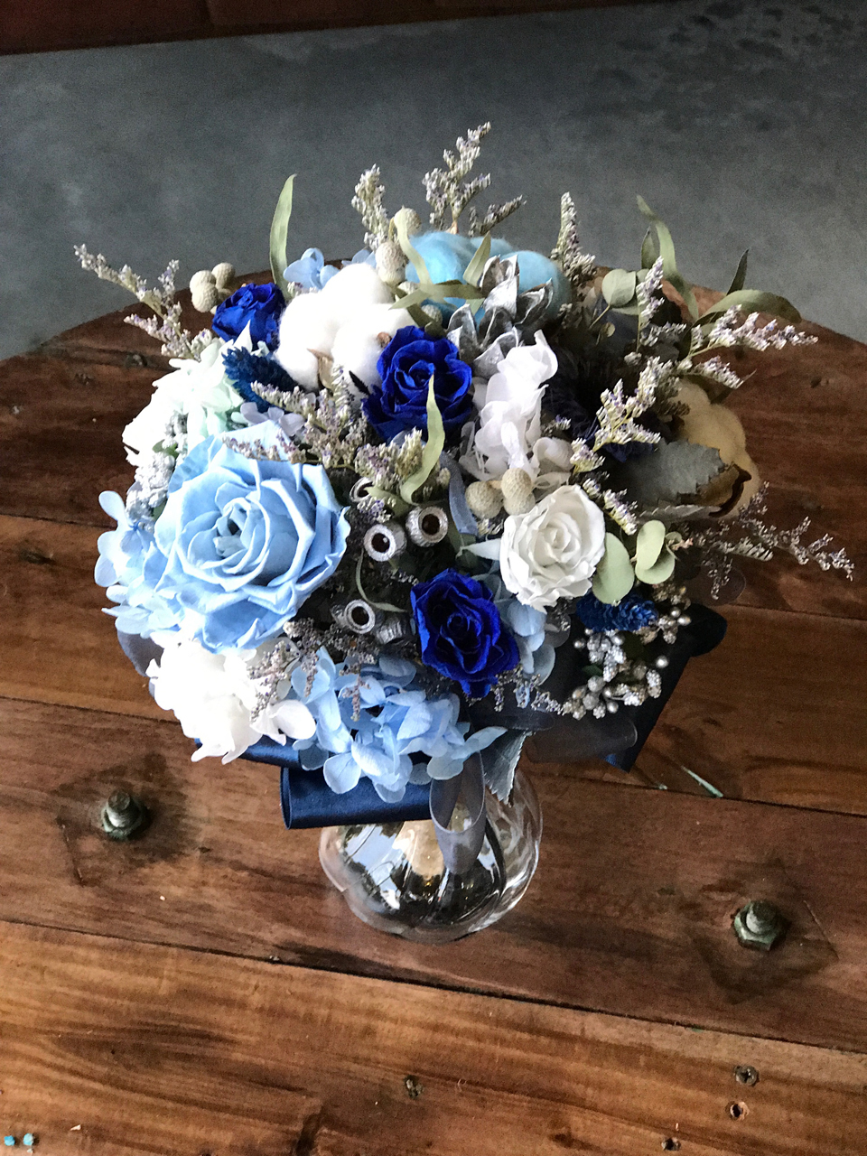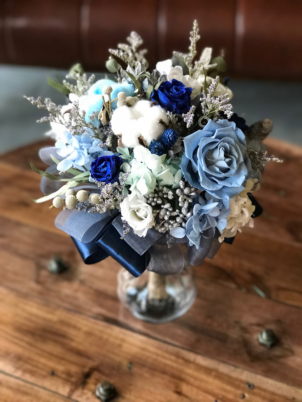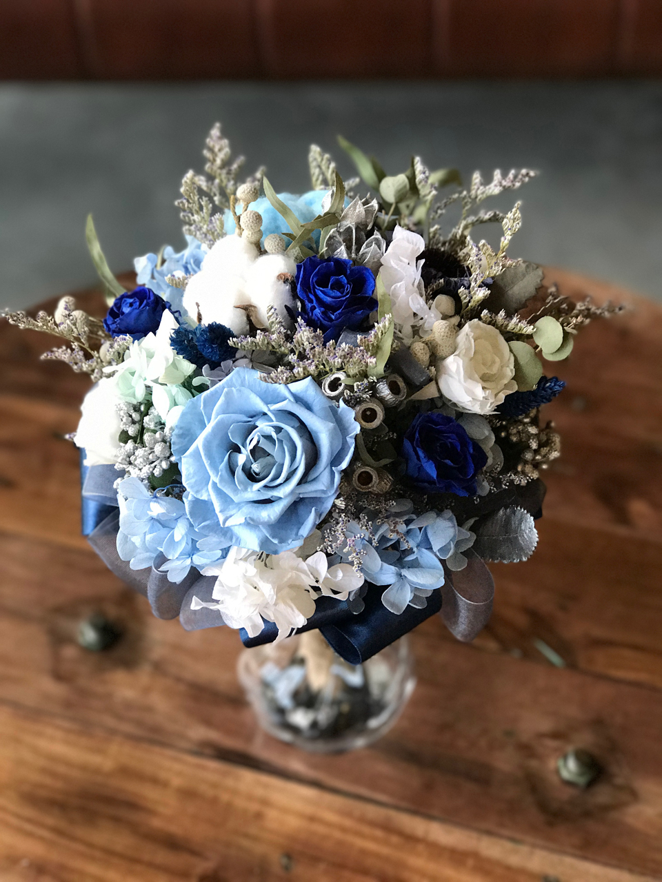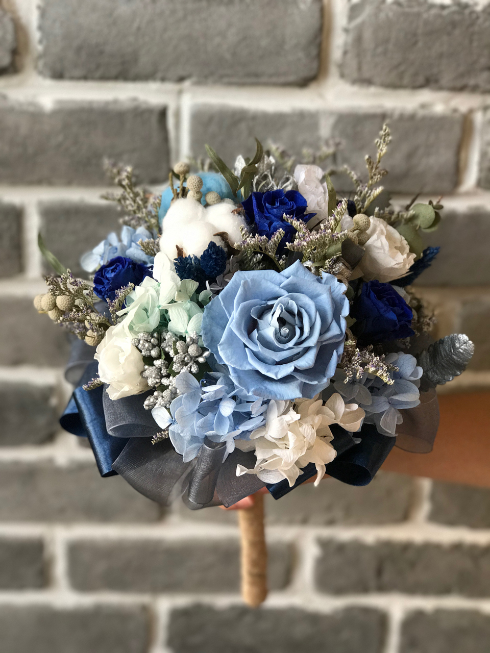 由永生花玫瑰.繡球.棉花.圓仔花.尤佳利.卡氏比亞製作而成的捧花