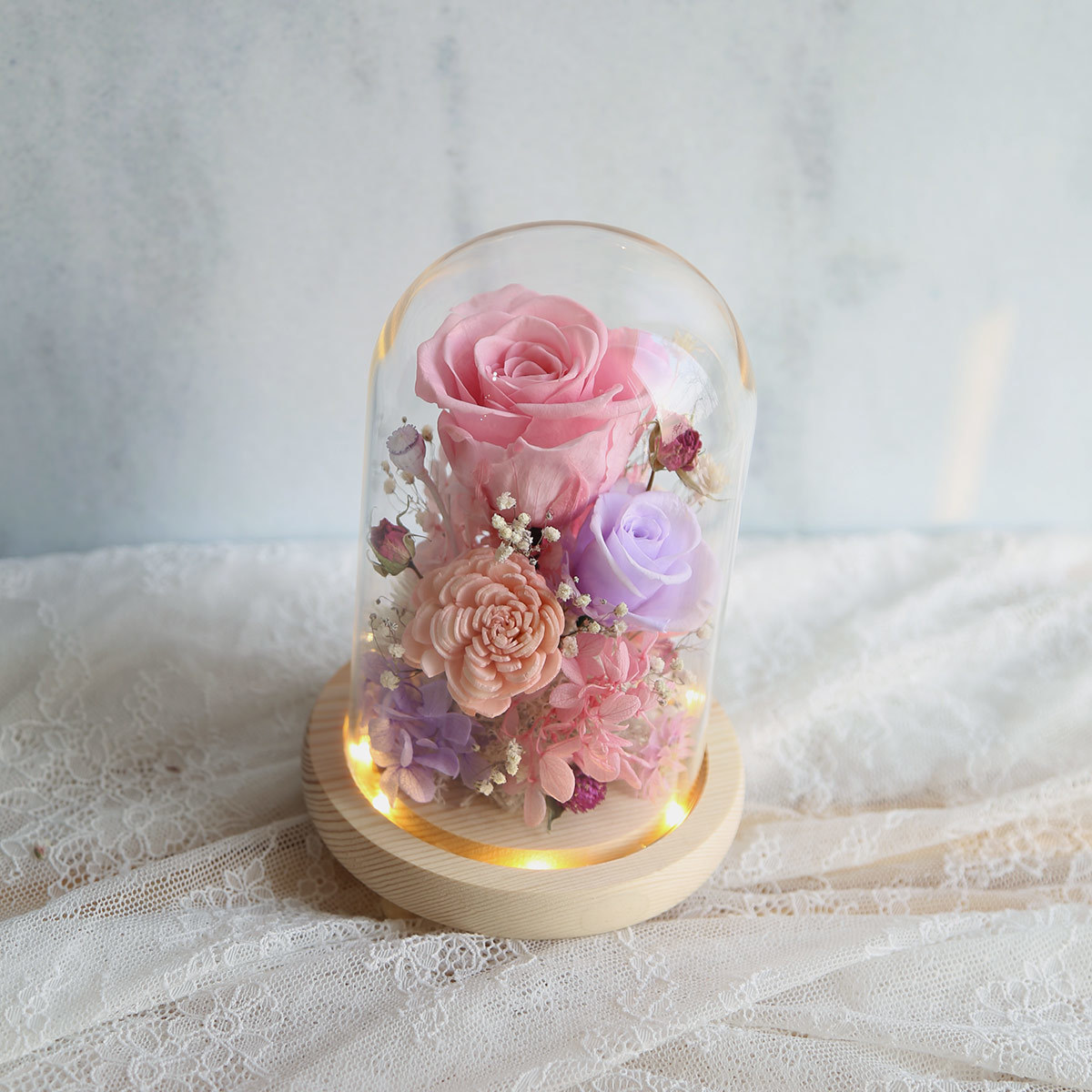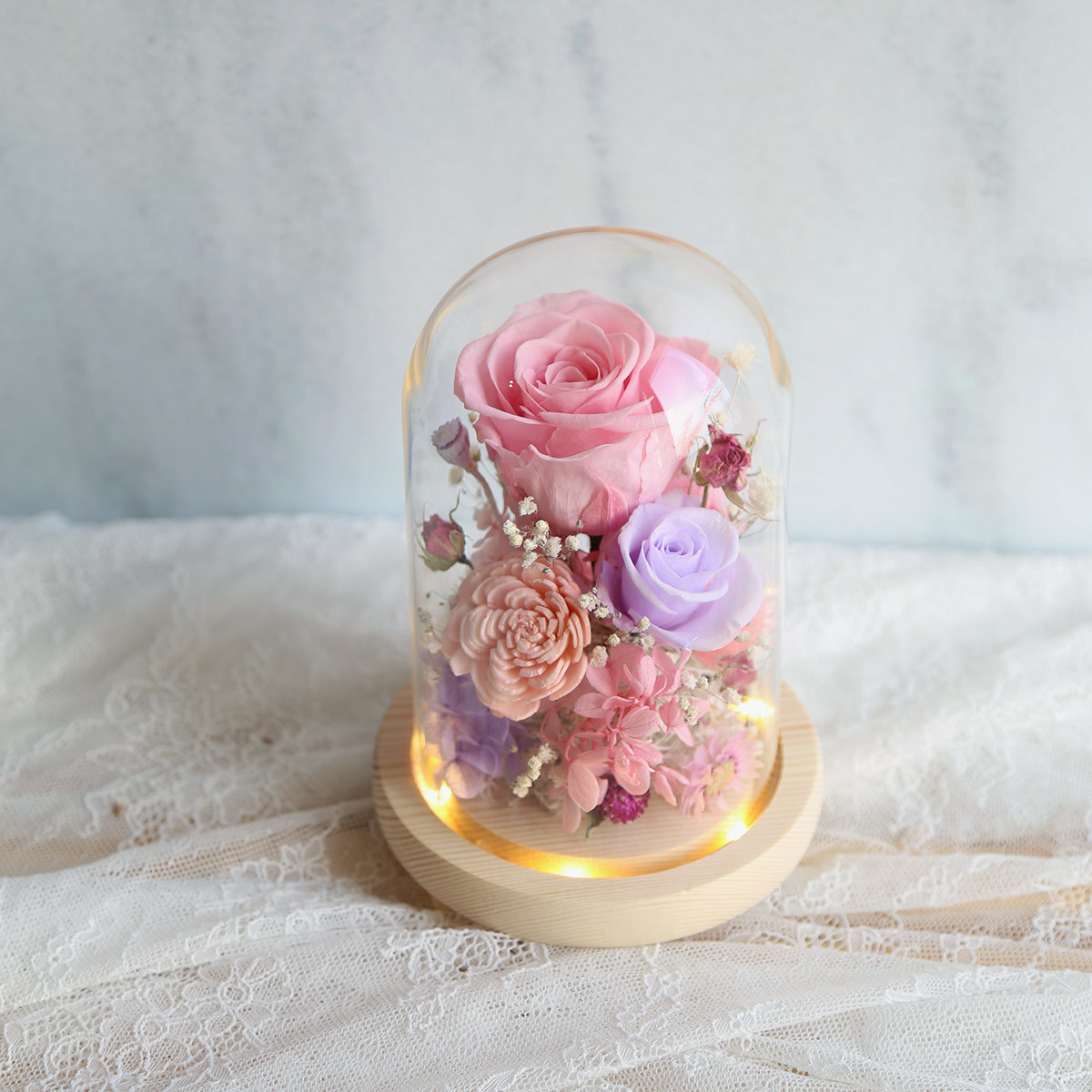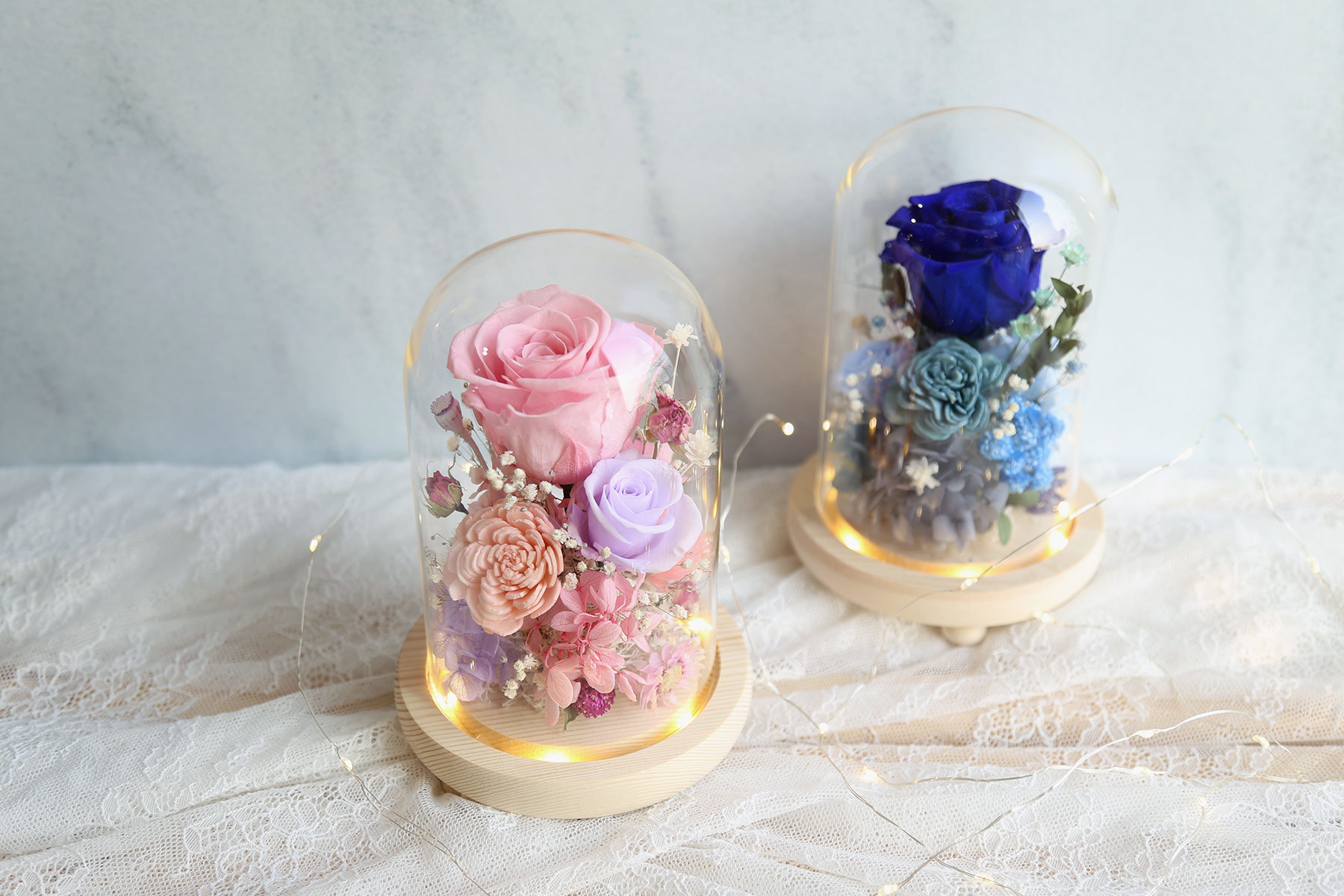 由永生花玫瑰.繡球.星辰花.旱雪蓮.水晶草製作而成的罩盅
