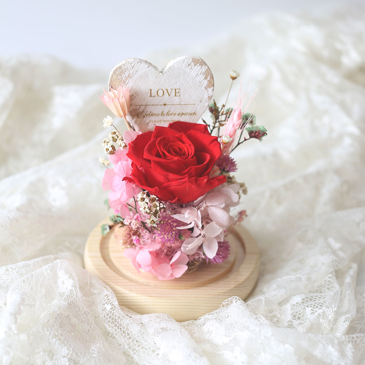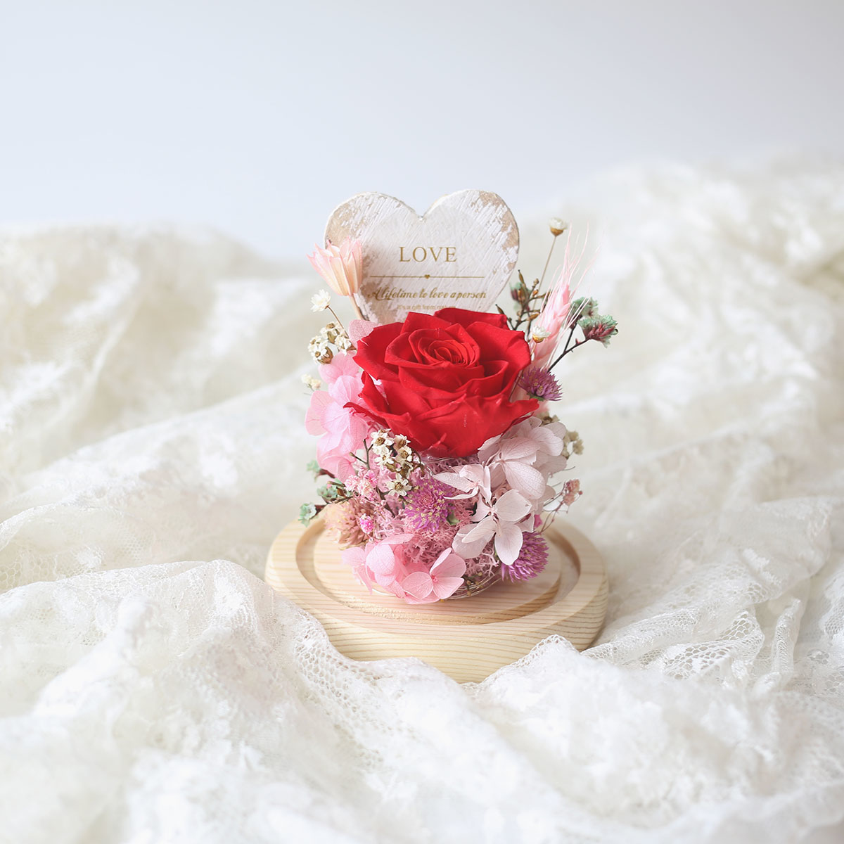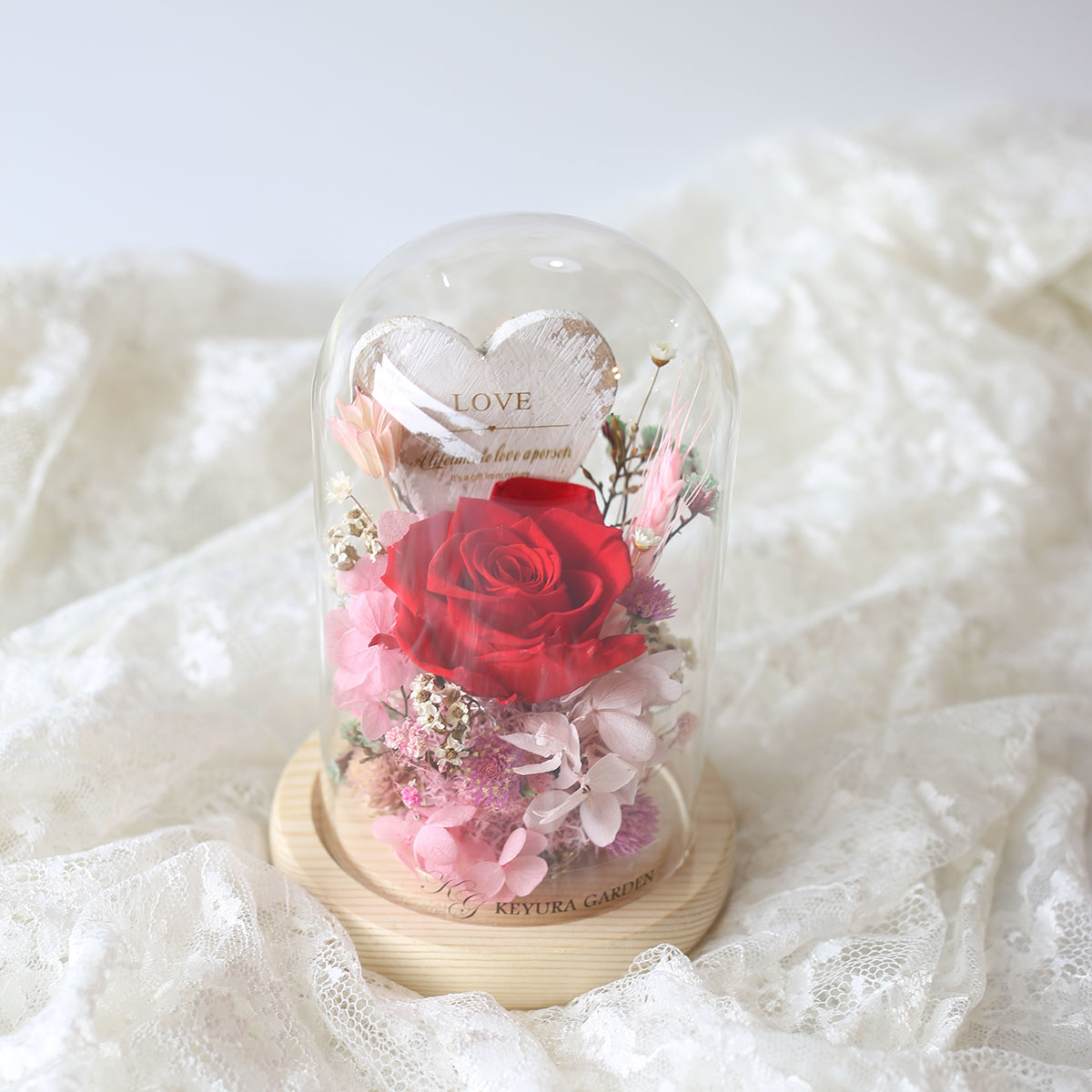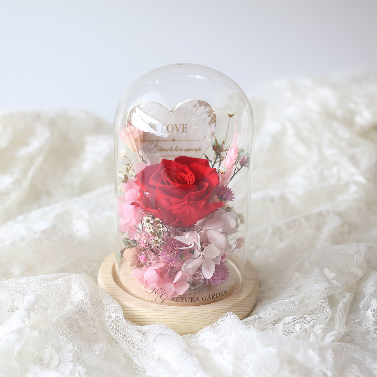由永生花玫瑰.繡球.圓仔花.法國白梅.水晶草製作而成的罩盅
