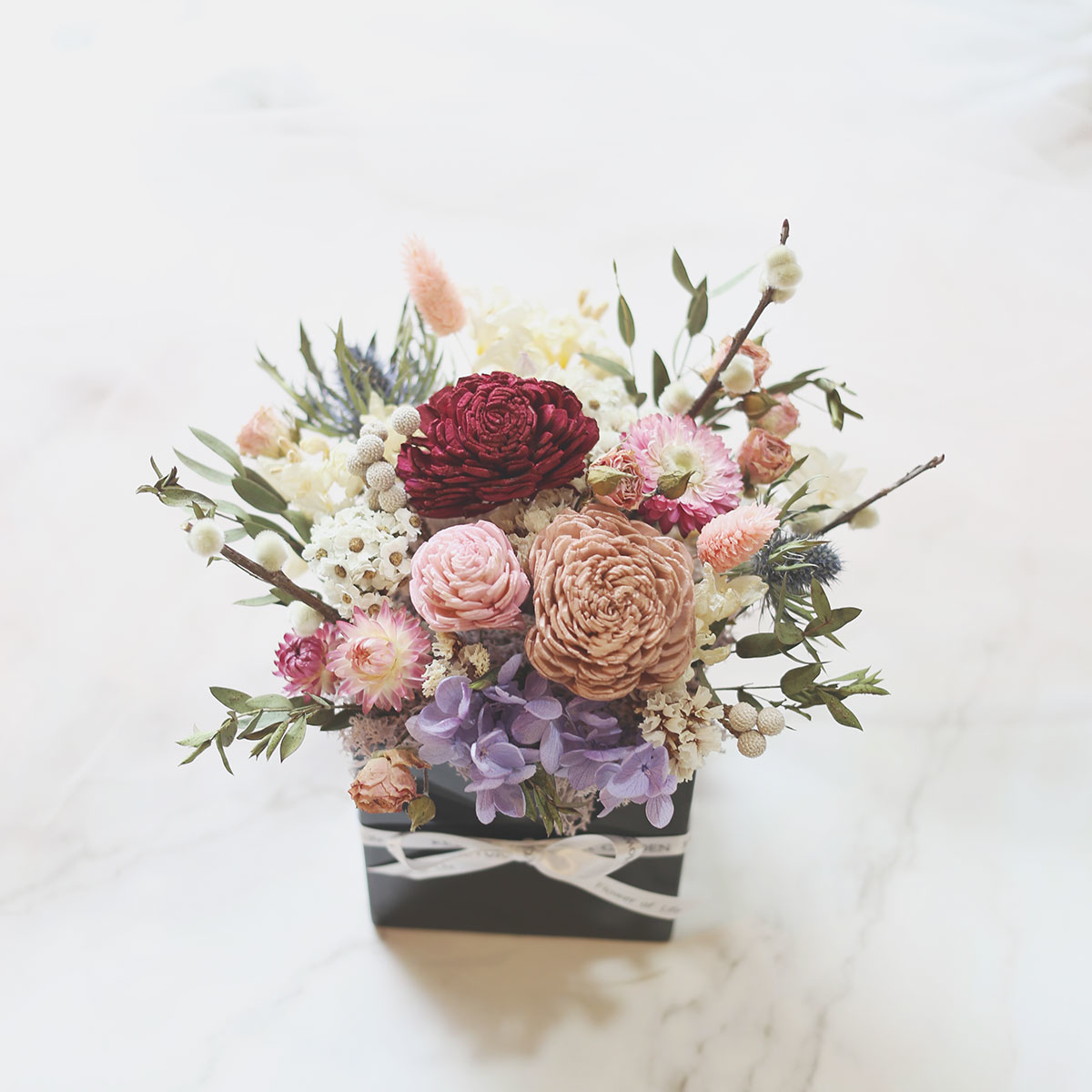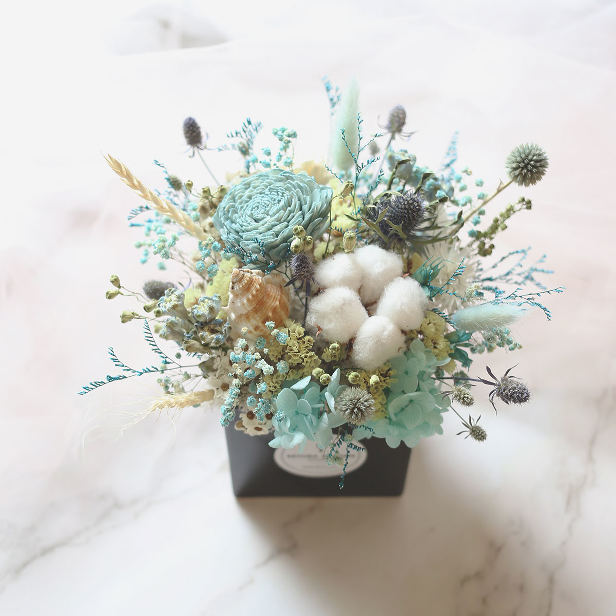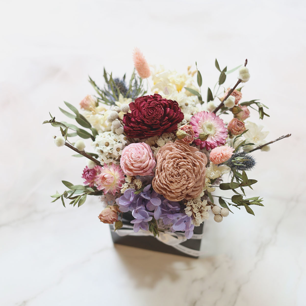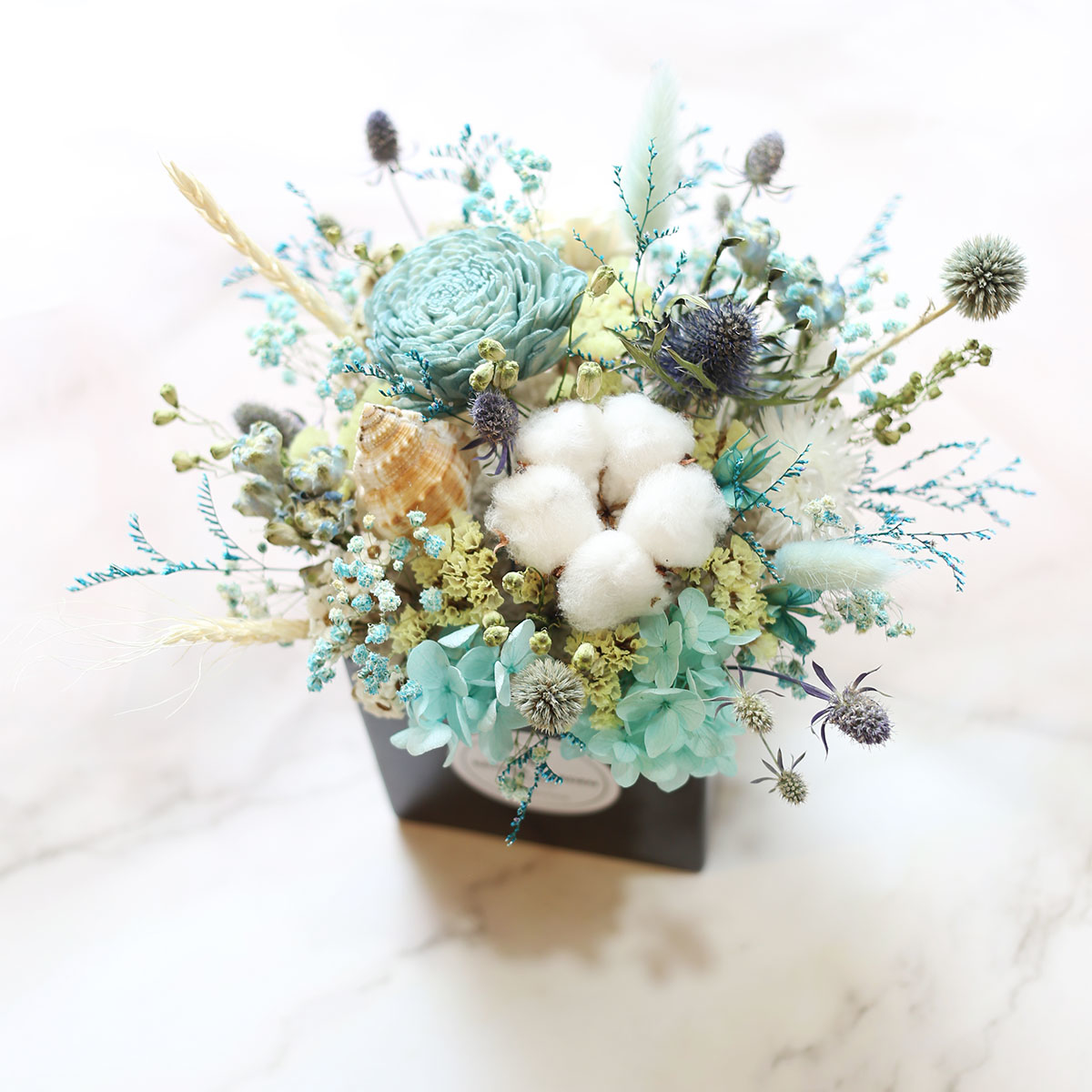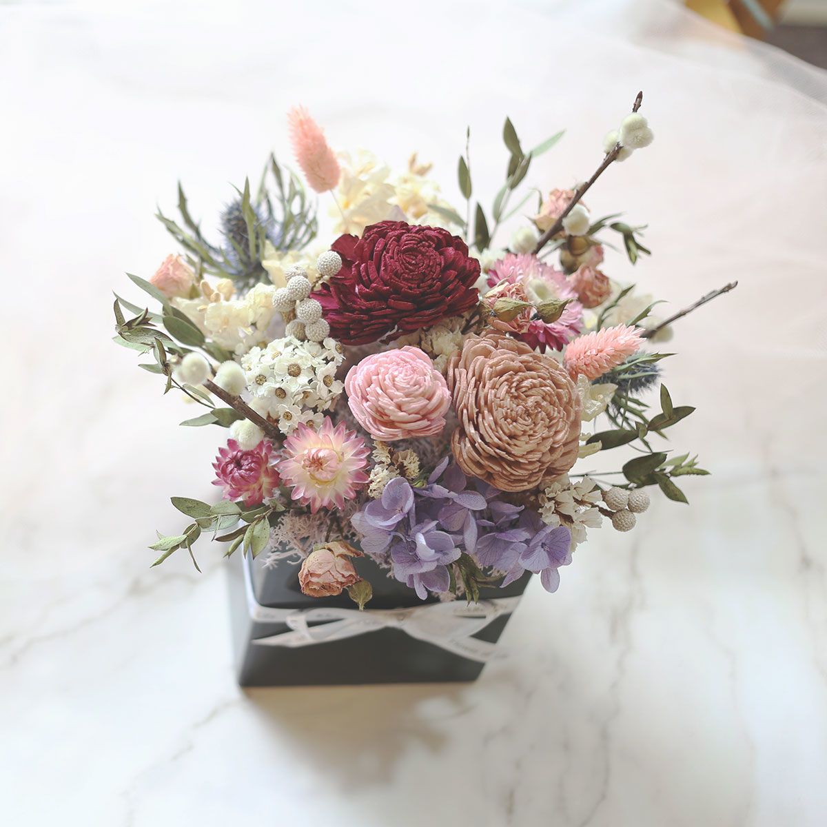 由永生花繡球.索拉玫瑰.麥桿菊.星辰花.兔尾草製作而成的盆花
