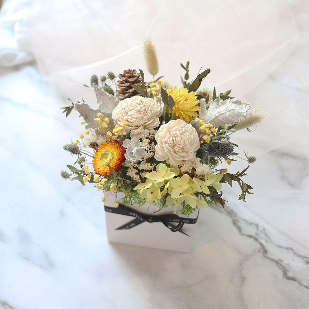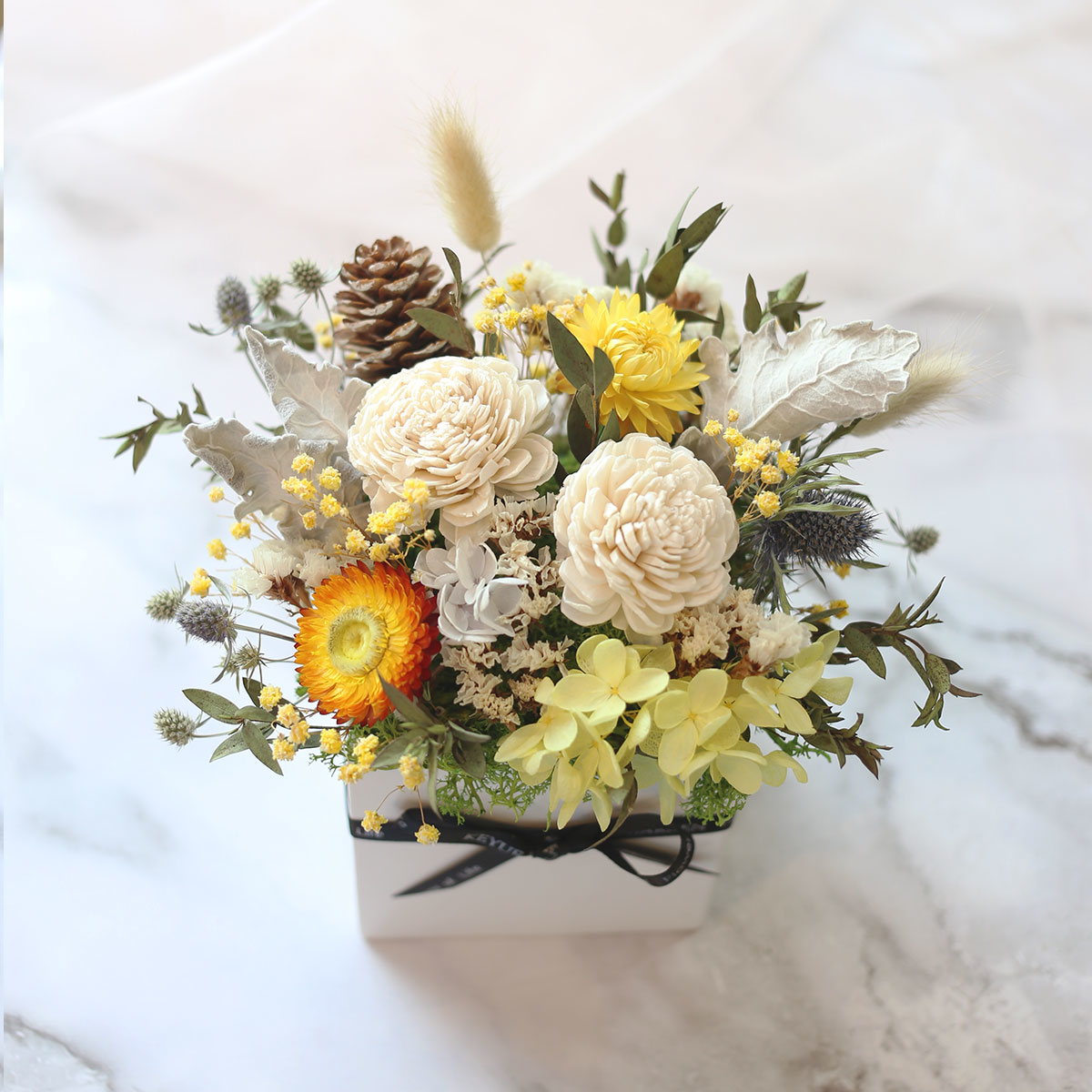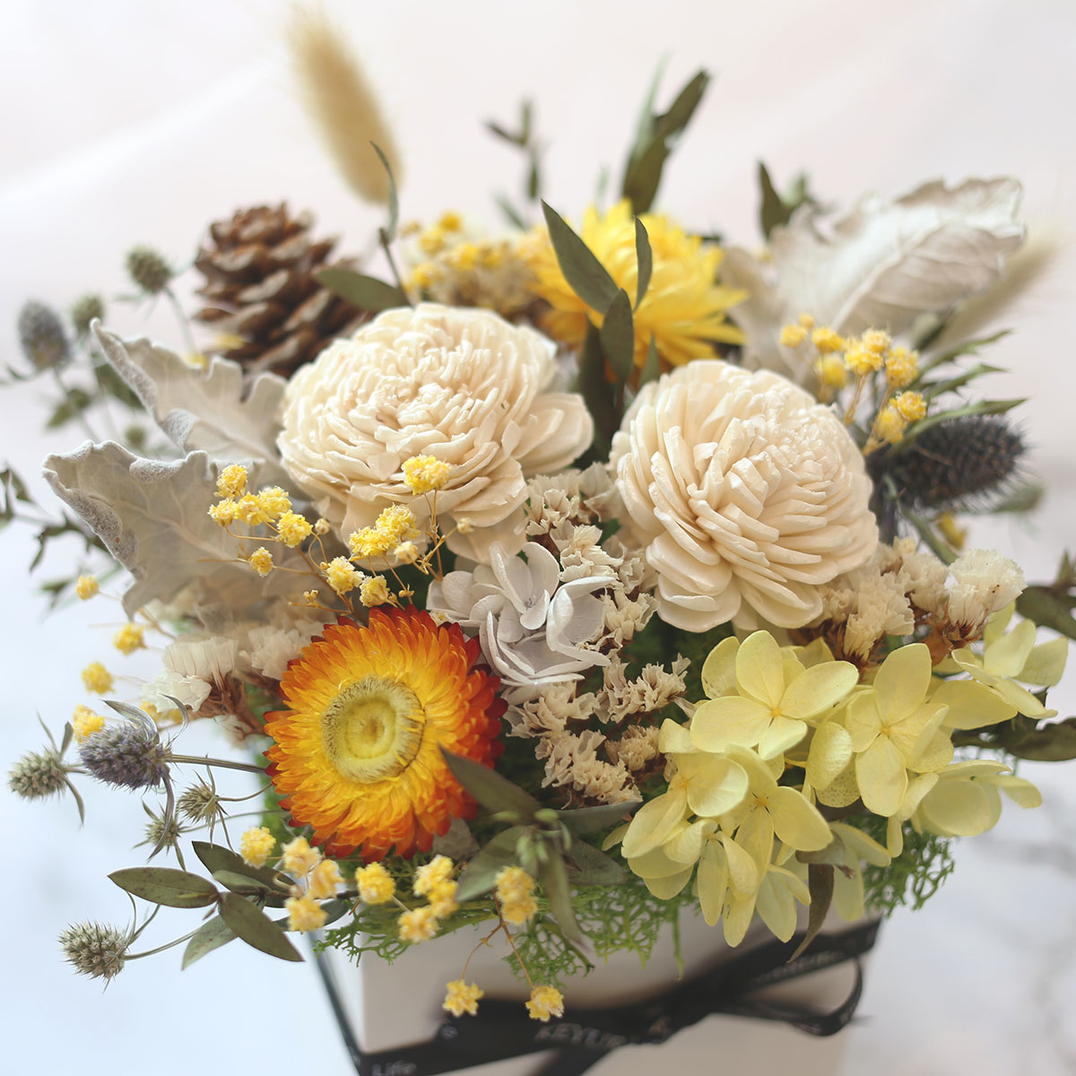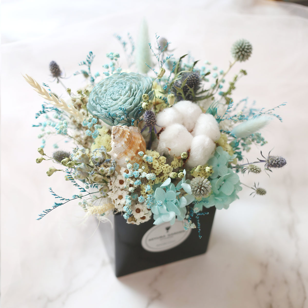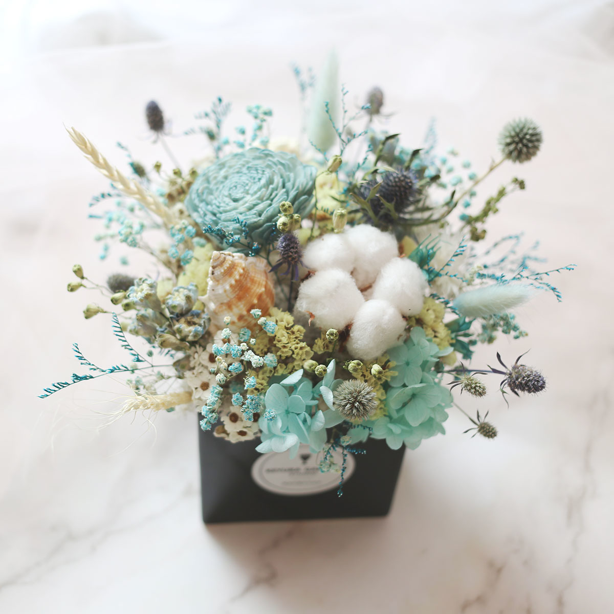 由永生花繡球.索拉玫瑰.麥桿菊.星辰花.兔尾草製作而成的盆花