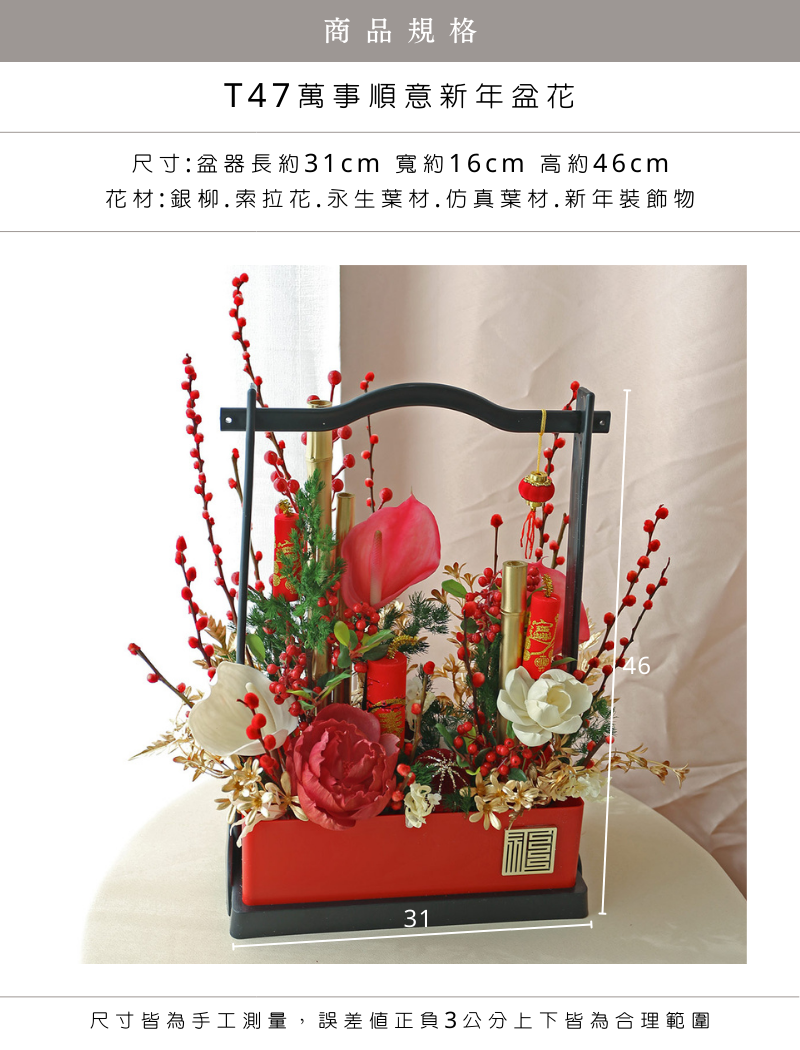 T47|萬事順意新年盆花|乾燥花/索拉花/永生葉材/高擬真花|新年提籃/春節賀禮