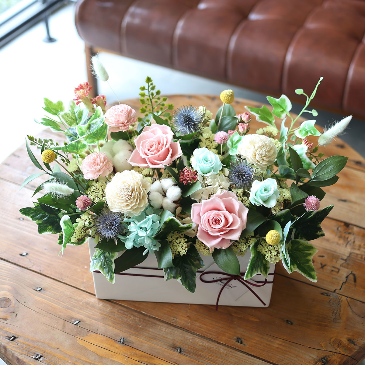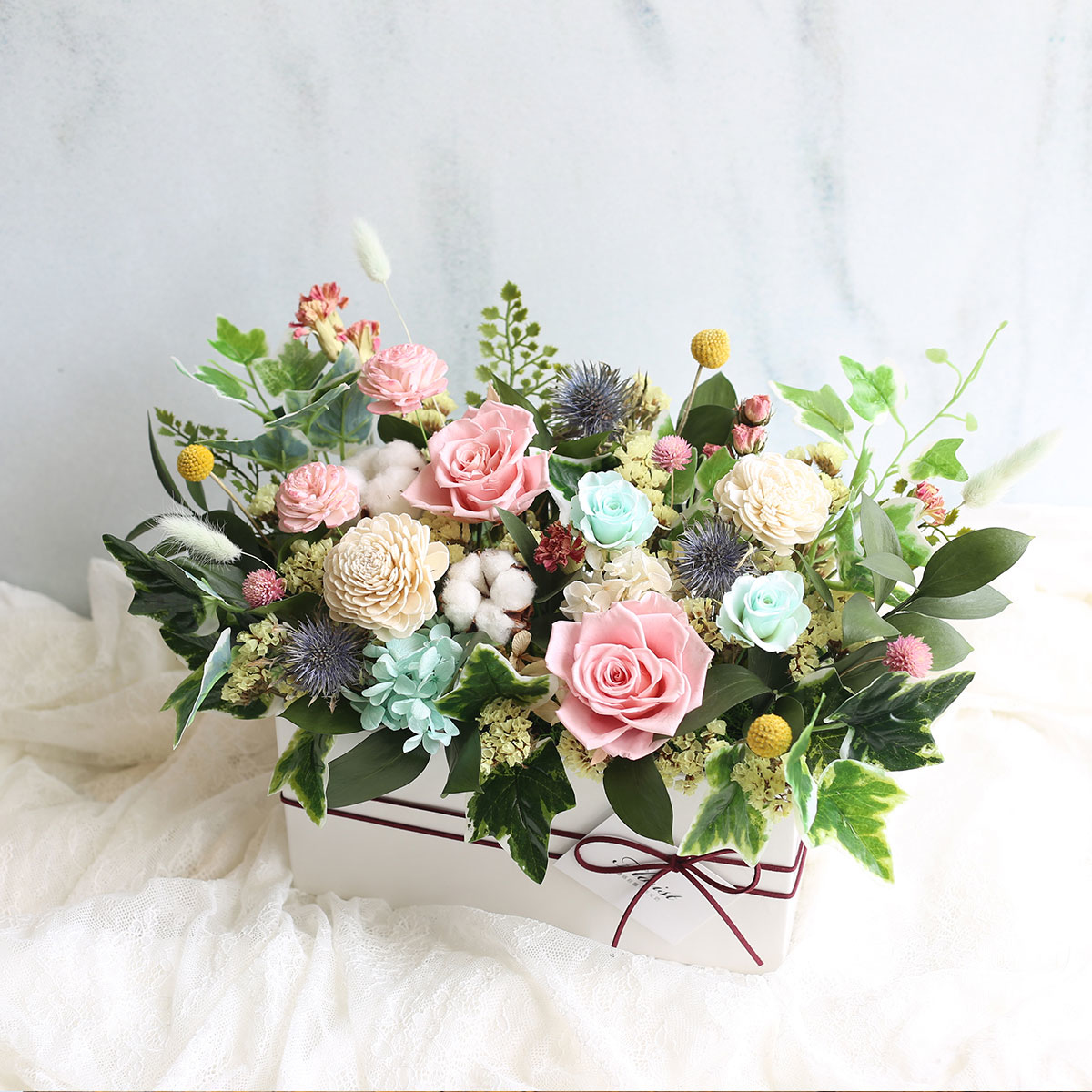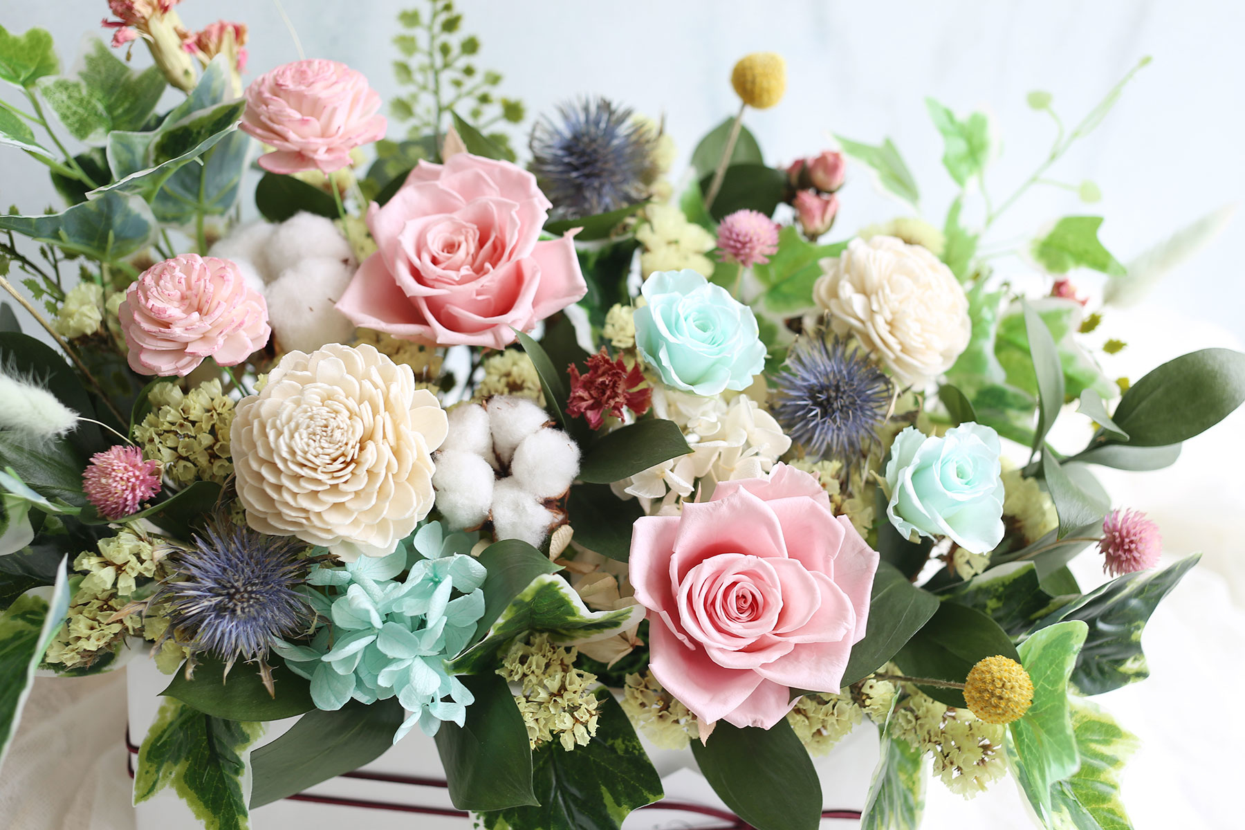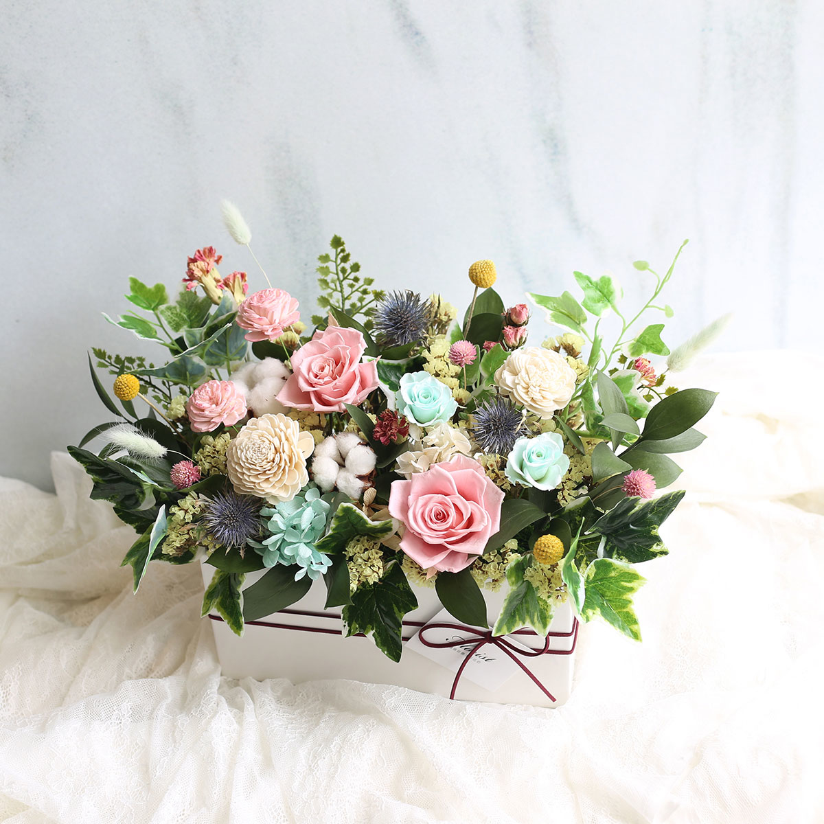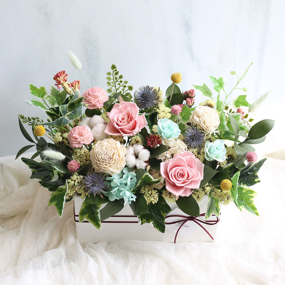永生花玫瑰.繡球.棉花.索拉玫瑰.星辰花.紫薊.圓仔花.金仗球.兔尾草.樺木葉等製作而成的盆花