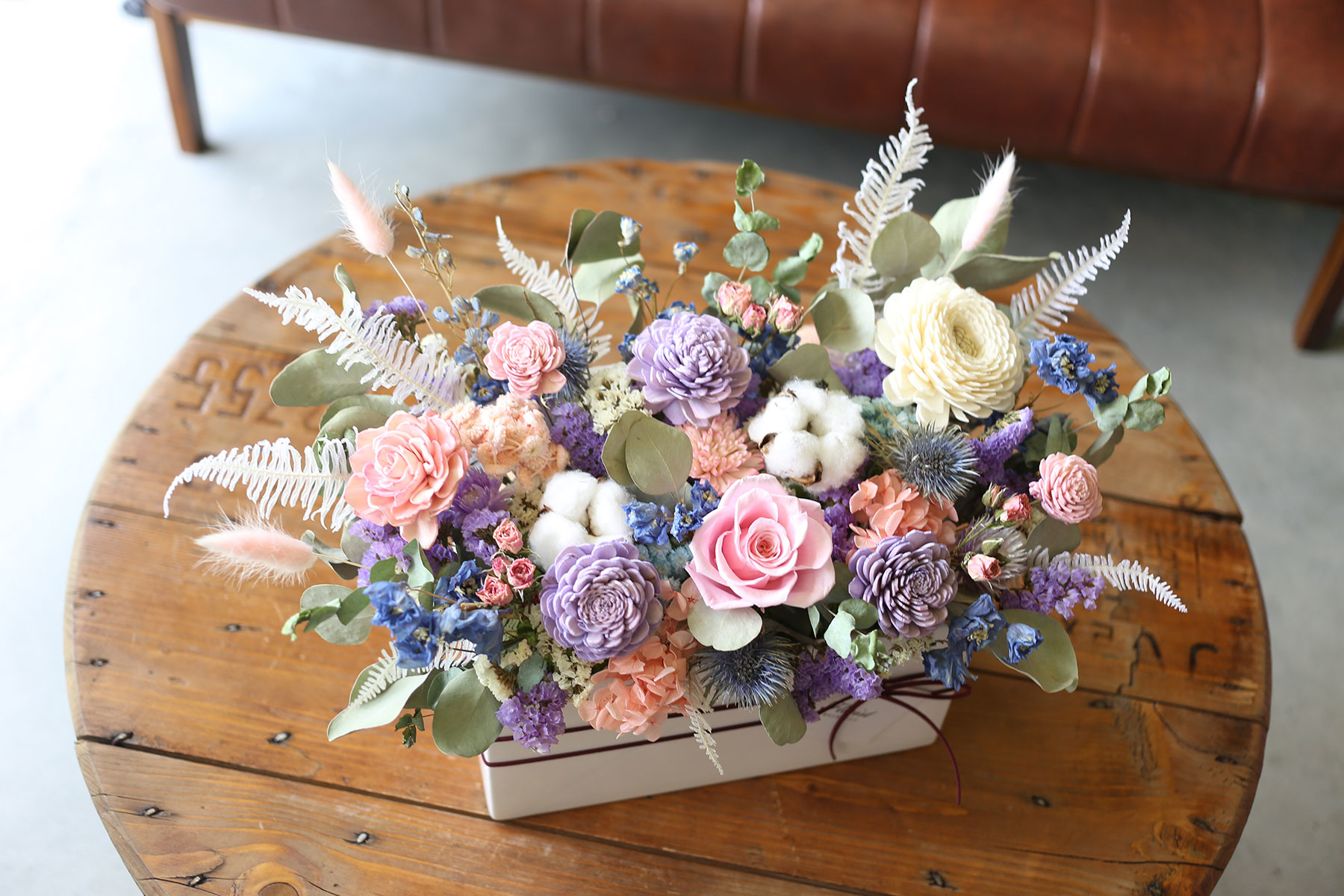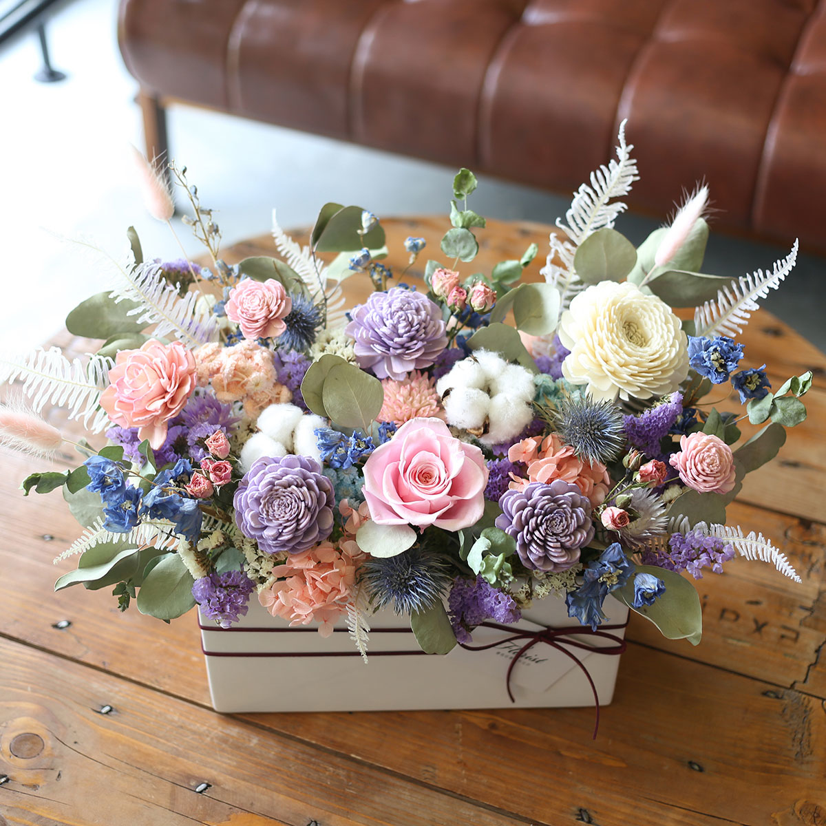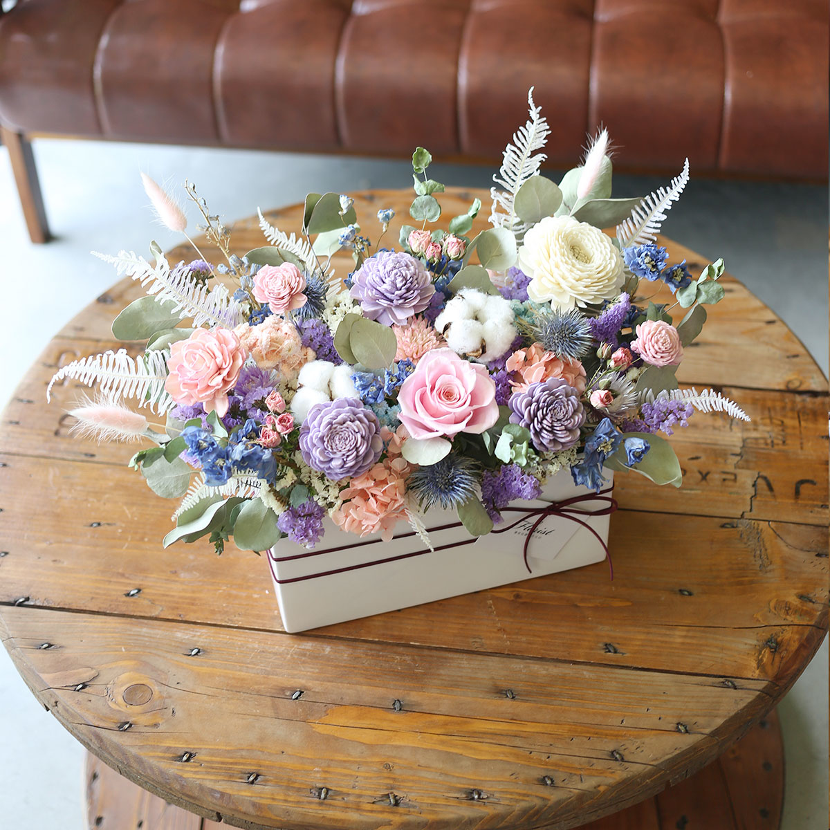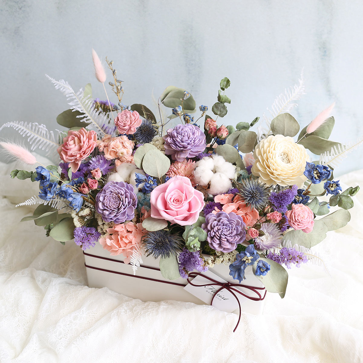 永生花玫瑰.繡球.棉花.索拉玫瑰.星辰花.紫薊.迷你玫.飛燕草.兔尾草.芒萁.乾燥由加利葉等製作