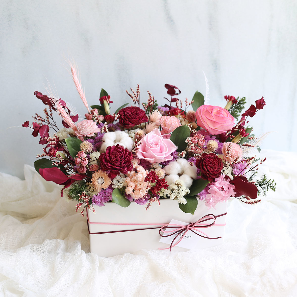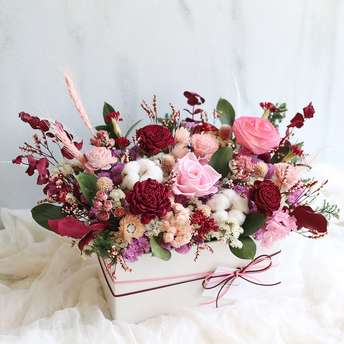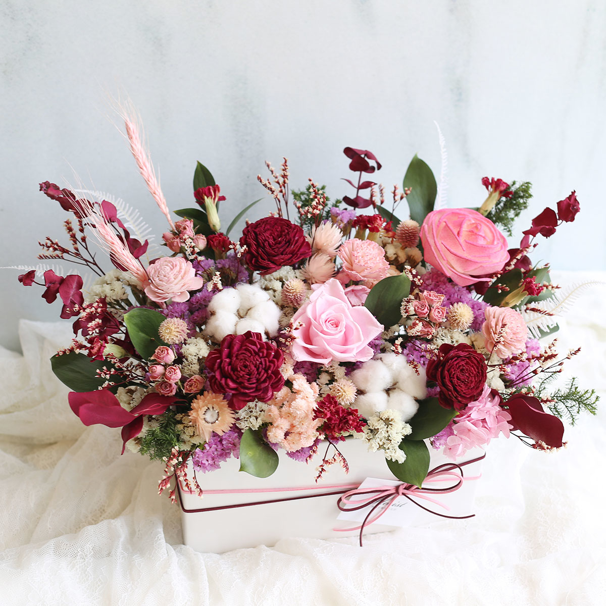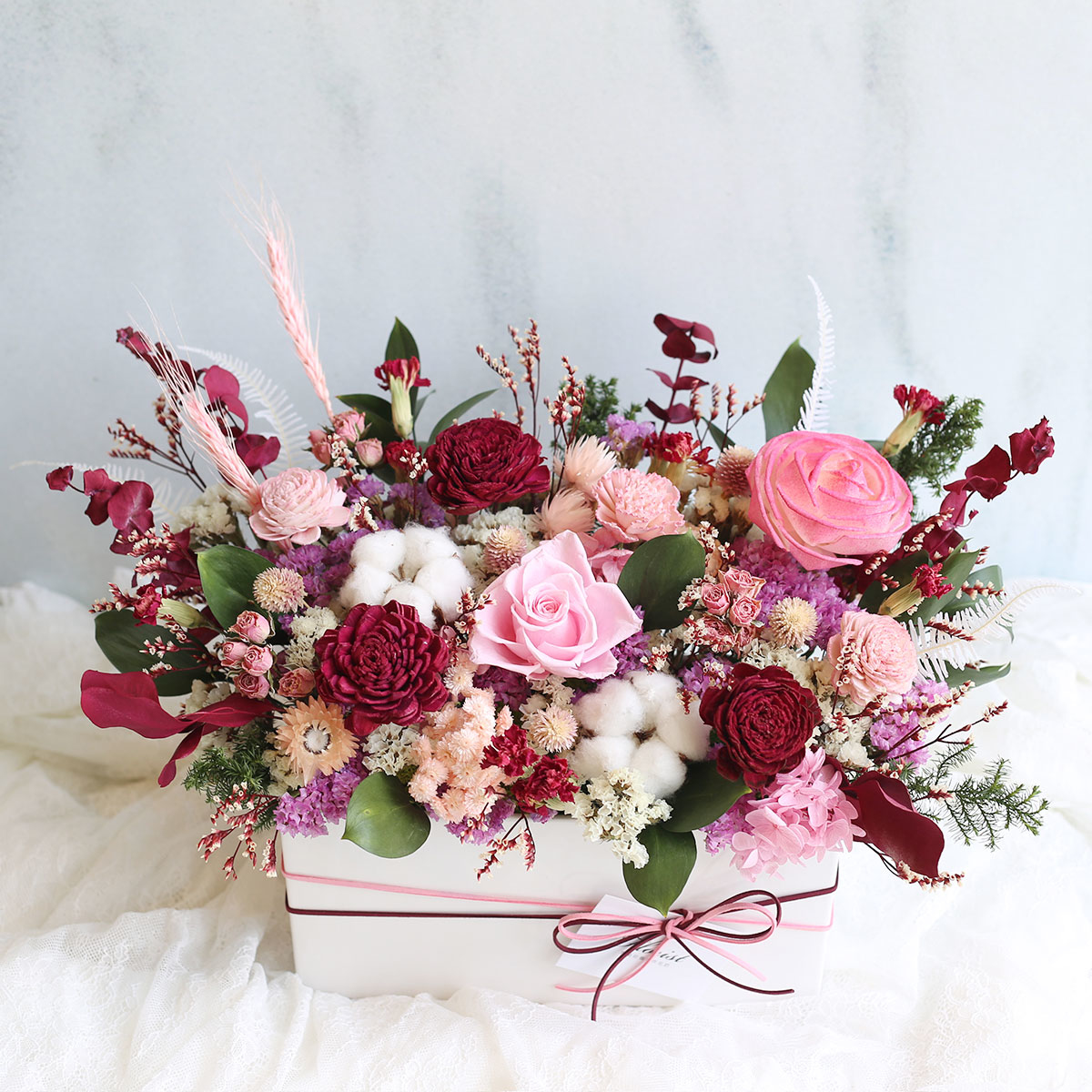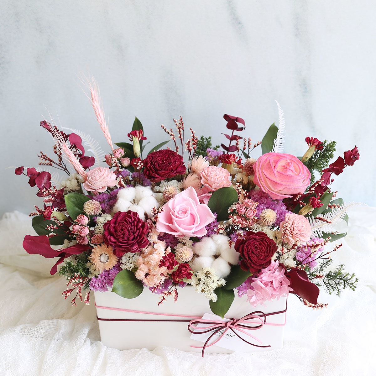 永生花玫瑰.繡球.棉花.索拉玫瑰.乾燥康乃馨.星辰花.迷你玫.圓仔花.芒萁.水晶草.樺木葉等製作